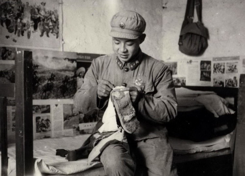 雷锋在补袜子