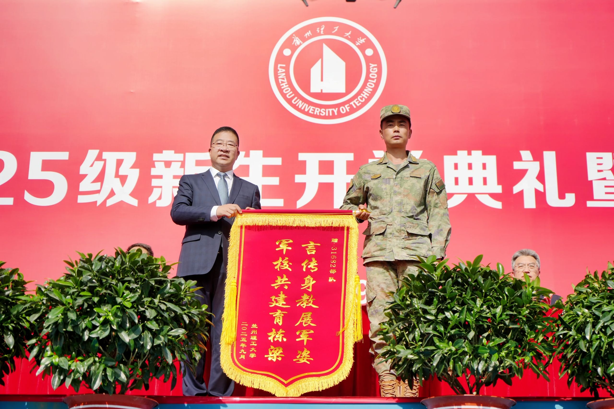 学校党委书记赵立香代表学校向承训部队赠送锦旗,感谢部队长期以来对学校国防教育与军训工作的大力支持,表达了“军校同心育英才”的深厚情谊。